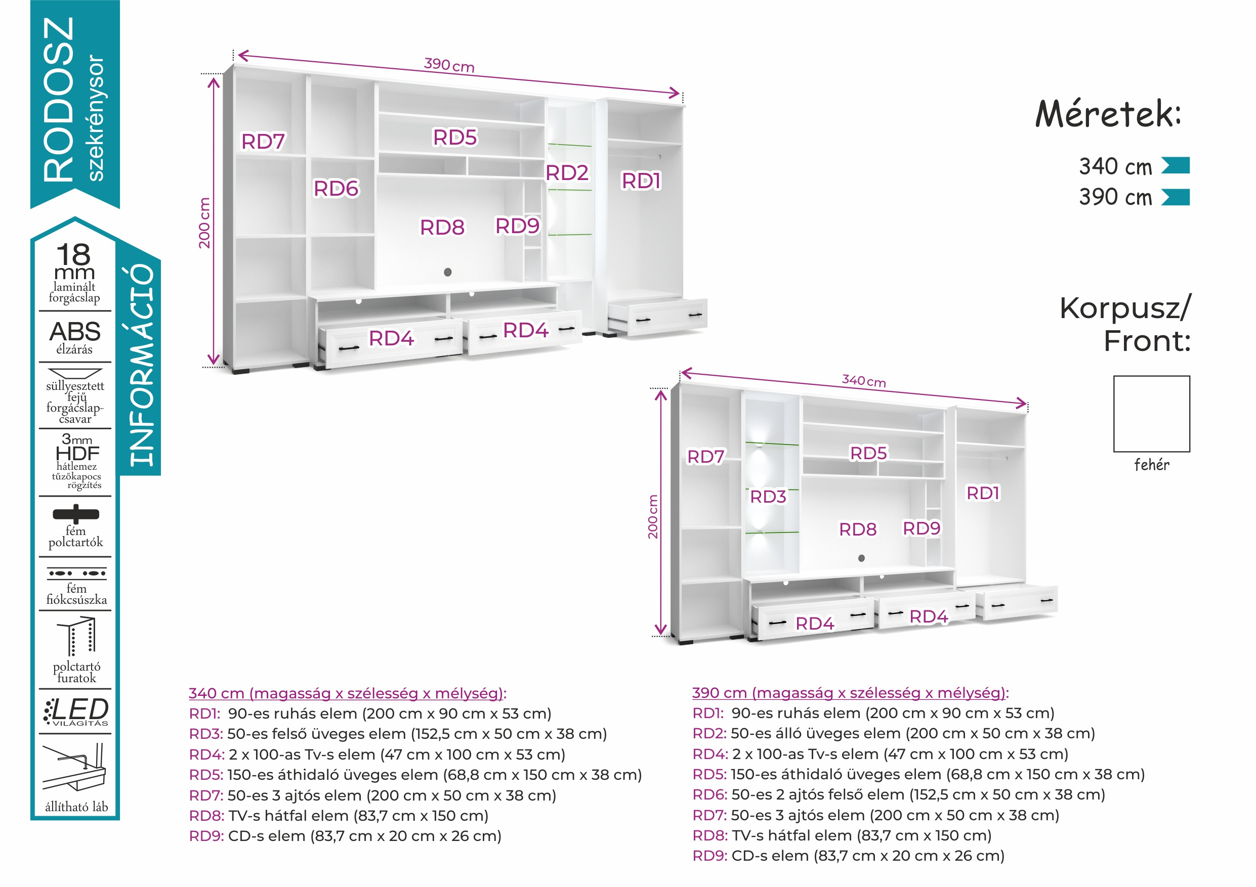A Rodosz bútor kiegészíthető egyéb szekrényelemekkel is, hiszen nem csak fix méretű szekrénysorként, hanem elemes változatban is gyártódik.